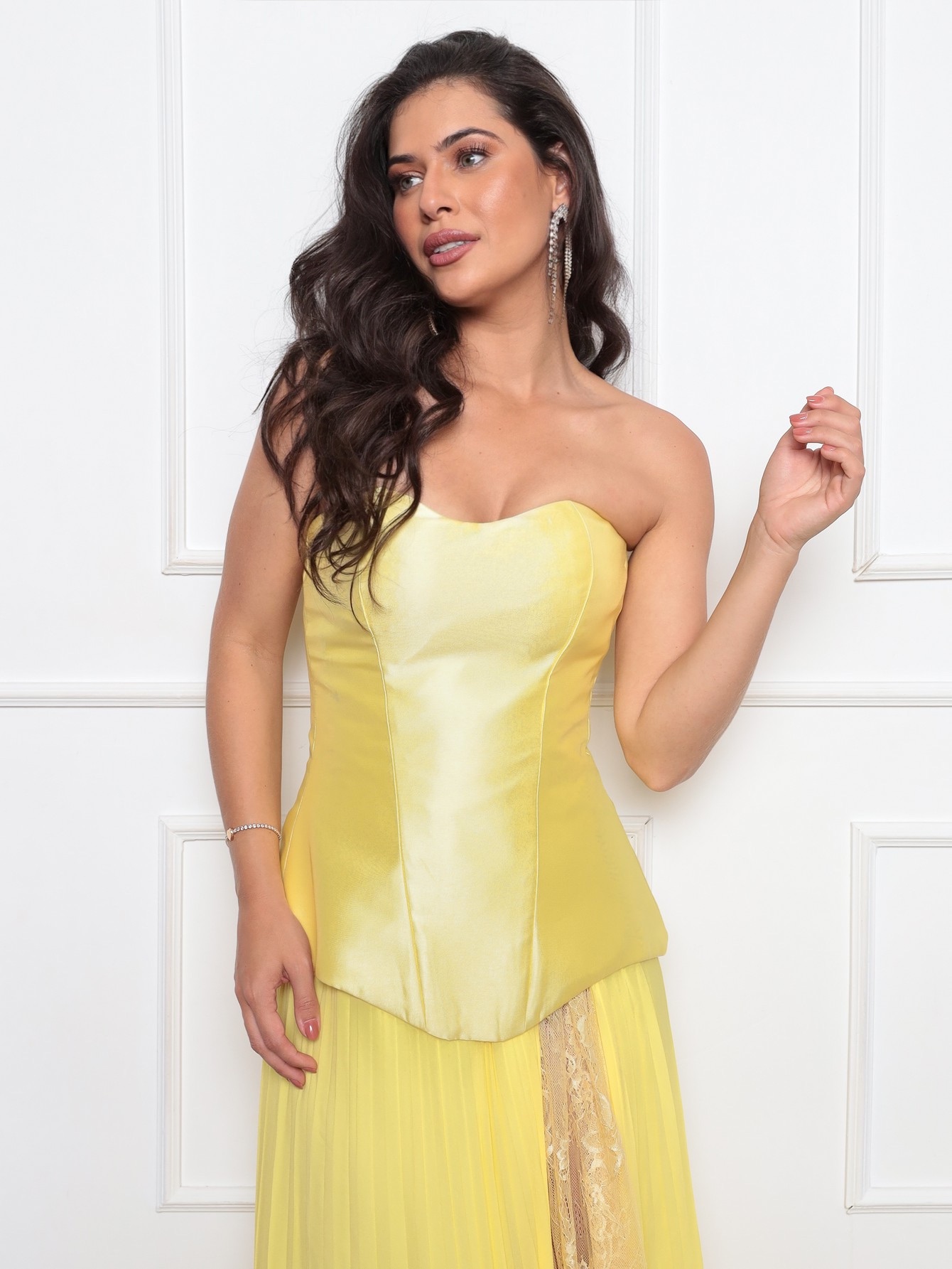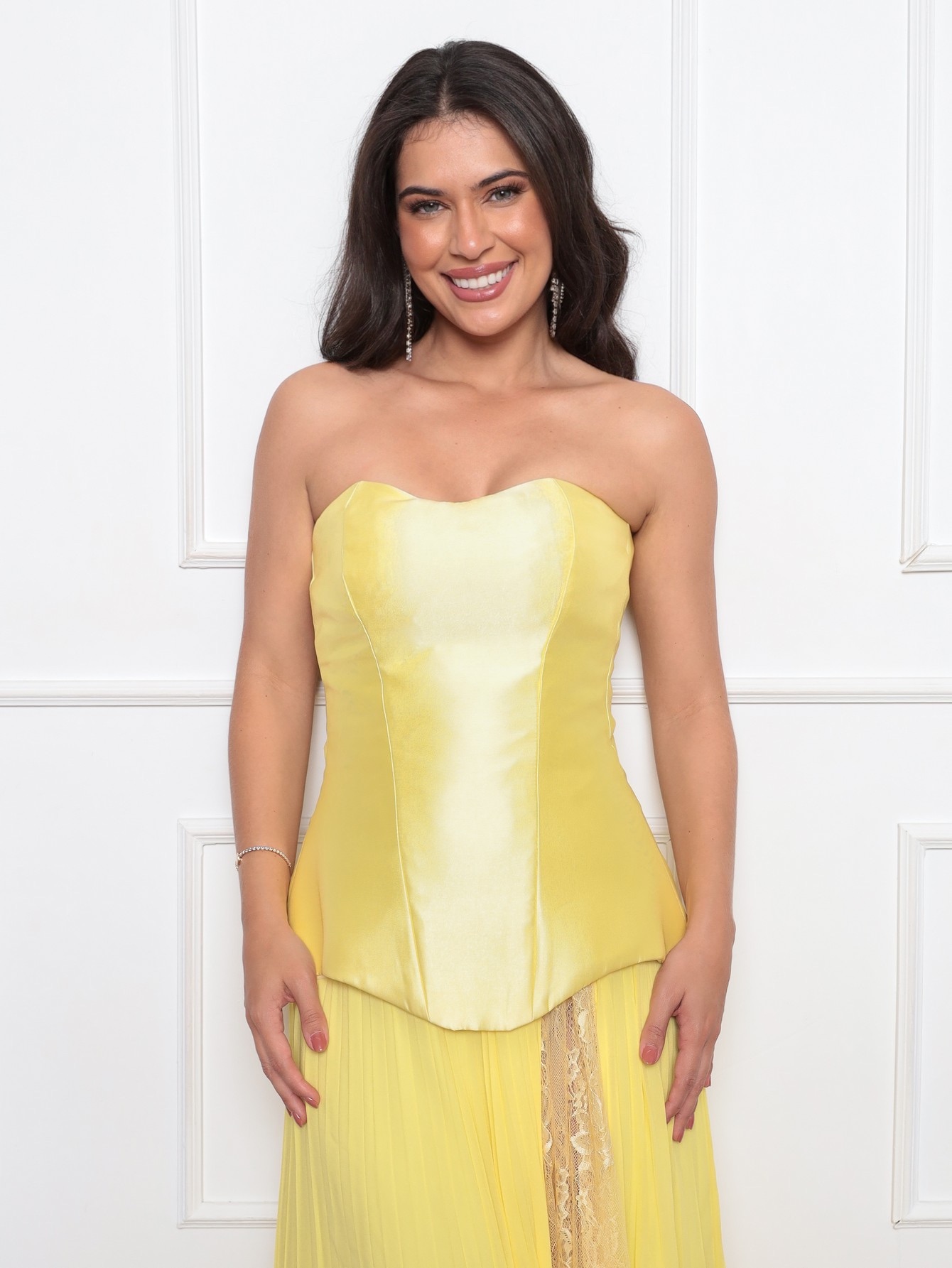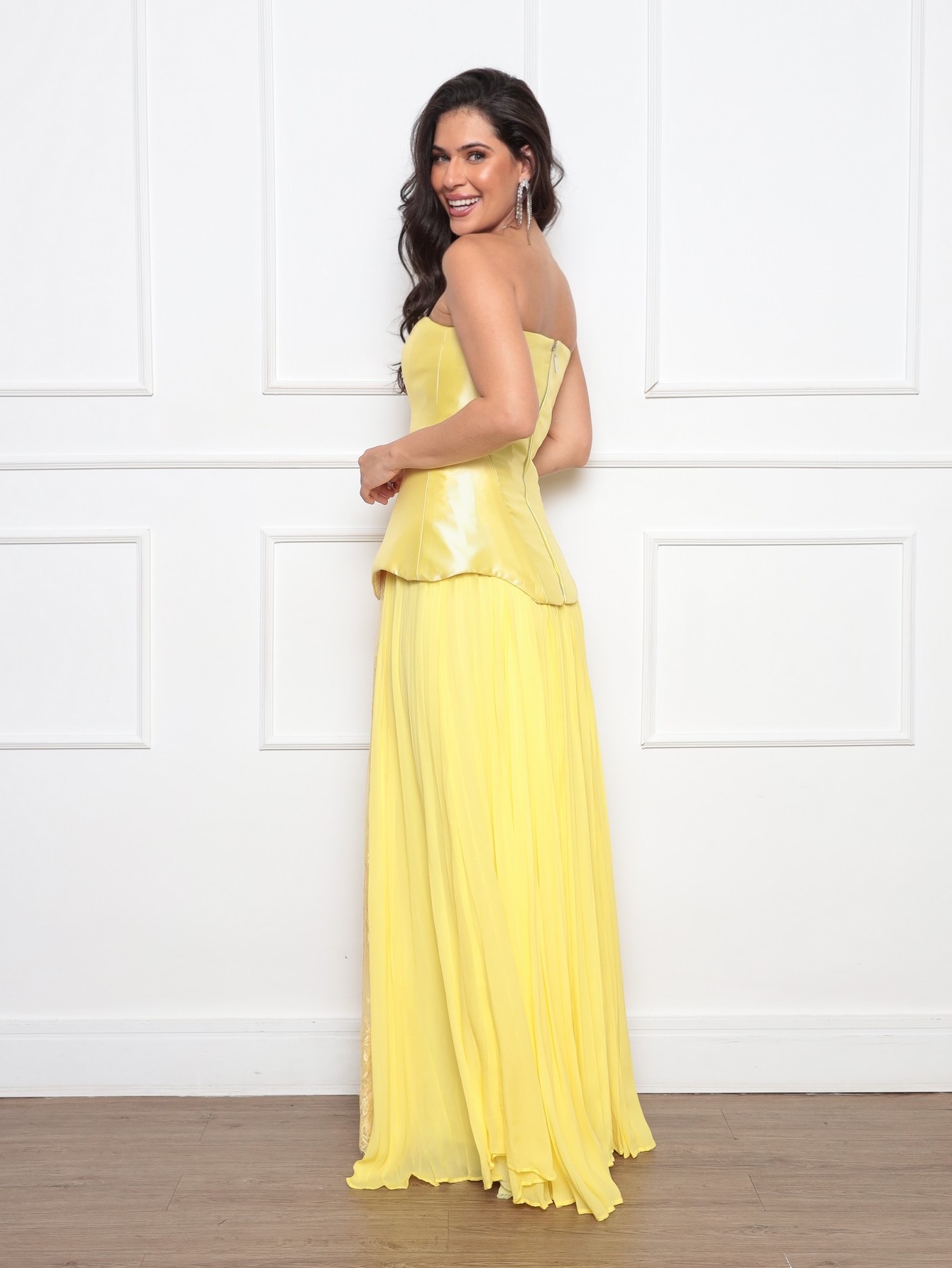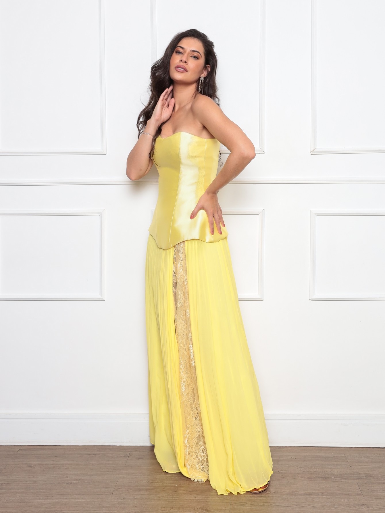 conjunto : saia musseline plissada com detalhe em renda chantilly, corpete em zibeline , com zíper destacavél nas costas .