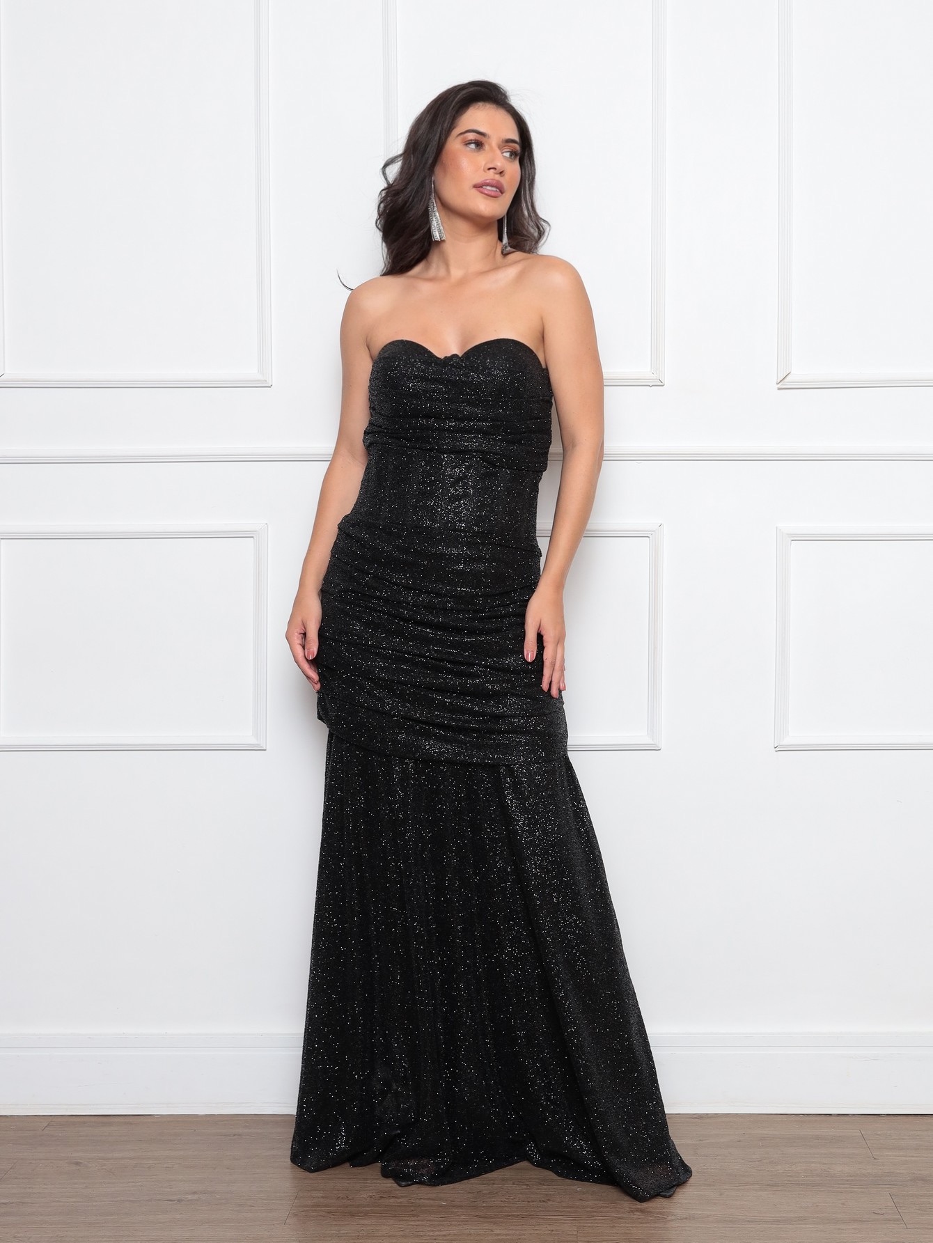 vestido de tafetá, com pregas macho na frente e costas. bolso faca na lateral .